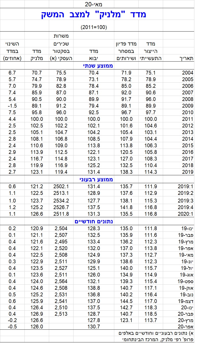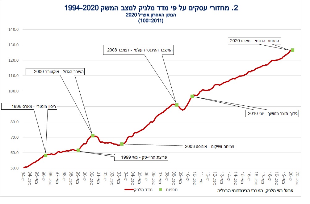 מדד מלניק למצב המשק ירד ב-0.5 אחוזים בחודש אפריל 2020. מדד אפריל מהווה איתות ראשון לפגיעה הכלכלית של מגפת הקורונה במשק הישראלי. השפעה מלאה יותר תתקבל במדד חודש מאי. על פי אומדן שלנו בחודש מרץ, מדד הייצור התעשייתי מנוכה עונתיות, ירד ב-4.0 אחוזים ומדד הפדיון בענפי המסחר והשירותים ירד ב-9.7 אחוזים (ראו הערה להלן). זיהוי מחזורי עסקים בישראל על פי מדד מלניק מצביע כי בחודש מרץ בא לסיום מחזור ממושך המכונה "גידול תוצר ממושך". מחזור זה החל בחודש יוני 2010, עקב המשבר הפיננסי הגדול (ראו איור 1 המצ"ב). המחזור החדש, המתחיל במרץ 2020, הוא ללא ספק מחזור של מיתון, שנגרם על ידי מגפת הקורונה.