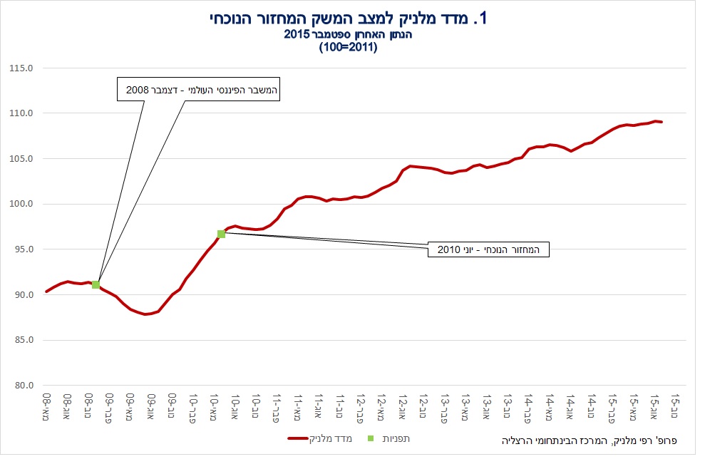מדד מלניק למצב המשק לא השתנה בחודש ספטמבר 2015. התפתחות המדד משקפת צמיחה מתונה של פעילות המגזר העסקי. מדד הייצור התעשייתי, המשקף את צד ההיצע של המגזר העסקי, עלה ותיקן חלקית את ירידת החודש הקודם. אולם, רמתו אינה חורגת מזו של חודש פברואר 2015 והוא משקף את קשיי היצוא של המשק, הממשיך להיות מושפע מחולשת הפעילות באירופה, מירידת הצמיחה בסין, וככל הנראה גם מחוזקו של השקל. מדד פדיון ענפי המסחר והשירותים, המשקף את הביקושים המקומיים ובעיקר את הצריכה הפרטית, עלה וממשיך לתמוך במגזר העסקי; הנתון עדיין לא משקף את תקופת פיגועי הטרור האחרונה. מדד היבוא, הכולל בעיקר יבוא תשומות לייצור מקומי אך גם מוצרי תצרוכת, ירד ומרמז על אפשרות של ירידת הפעילות בחודשים הבאים. מספר משרות השכירים במגזר העסקי ירד ויתכן כי הוא מבשר על חולשה אפשרית בשוק העבודה.