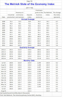 מדד מלניק למצב המשק עלה ב-0.1 אחוז בחודש אוגוסט 2016. צמיחת המגזר העסקי נמשכת בשיעור מתון. רמתו הגבוהה של מדד פדיון ענפי המסחר והשירותים, המשקף את הביקושים המקומיים ובעיקר את הצריכה הפרטית, ממשיכה לסמן את תרומת הצריכה הפרטית לצמיחת המשק. כידוע, הצריכה הפרטית מובילה את צמיחת המשק בשנים האחרונות. מדד הייצור התעשייתי, המשקף את צד ההיצע של המגזר העסקי, אינו מצליח לפרוץ את מצב הקיפאון בו הוא שרוי. מצב זה ימשך, ככל הנראה, כל עוד לא נחלץ המצב הכלכלי בעולם מהמשבר הפיננסי המתמשך. מדד היבוא, הכולל בעיקר יבוא תשומות לייצור מקומי אך גם מוצרי תצרוכת, מתנדנד סביב רמה נתונה, ללא מגמה ברורה למעלה או למטה. מספר משרות השכירים במגזר העסקי עקבי עם הצמיחה המתונה של המשק; לא ניכרת חולשה בשוק העבודה.