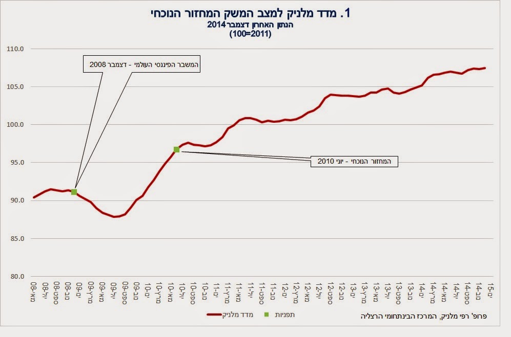 מדד מלניק למצב המשק עלה ב-0.1 אחוז בחודש דצמבר 2014. המשק ממשיך לצמוח בקצב מתון. מדד היבוא, הכולל בעיקר יבוא תשומות לייצור מקומי אך גם מוצרי תצרוכת, עלה בשיעור חריג של 13.1 אחוזים, והעלה את המדד כולו. ייתכן שהדבר מבשר גידול הייצור והצריכה הפרטית, בחודשים הבאים. ניכרת חולשה בהתפתחות הייצור התעשייתי. פדיון ענפי המסחר והשירותים, המשקף את הביקושים המקומיים ובעיקר את הצריכה הפרטית, ירד אך רמתו נותרה גבוהה. מספר משרות השכירים במגזר העסקי ירד, לאחר שעלה בחודש הקודם ורמתו משקפת יציבות בשוק העבודה.