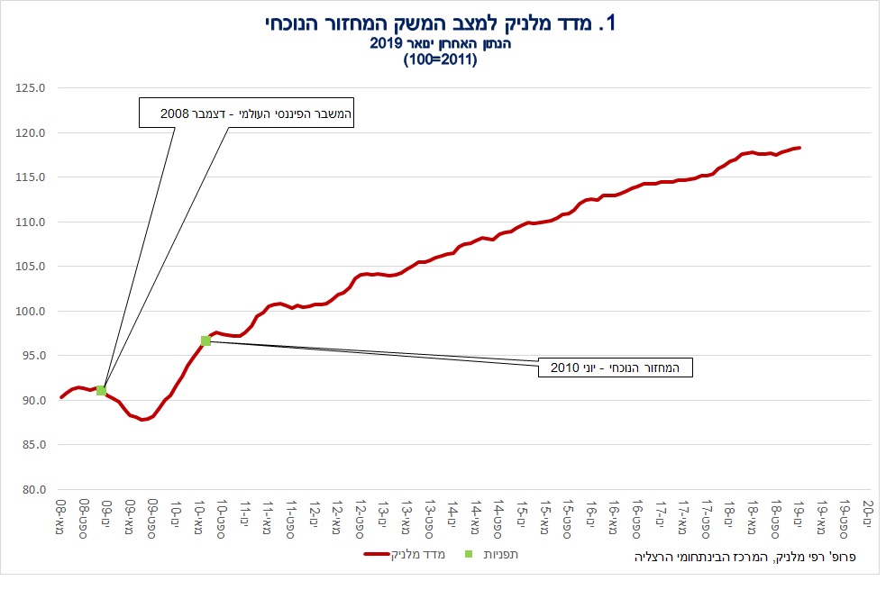 מדד מלניק למצב המשק בשנת 2018 עלה ב-2.3 אחוזים, נמוך מפוטנציאל הצמיחה של המשק. בחודש ינואר 2019 עלה המדד ב-0.1 אחוז. צמיחת המגזר העסקי נמשכת בשיעור מתון. פדיון ענפי המסחר והשירותים, המשקף את הביקושים המקומיים ובעיקר את הצריכה הפרטית, ירד בחודשיים ברציפות. התפתחות זו מבטאת שינוי בהרכב הביקושים המקומיים; ניתן לקבוע שבניגוד לשנים האחרונות, הצריכה הפרטית אינה מובילה את צמיחת המשק. מדד הייצור התעשייתי, המשקף את צד ההיצע של המגזר העסקי, אינו מצליח להתרומם והושפע, ככל הנראה, מההאטה המסתמנת באירופה, המקשה על היצוא. רמת מדד היבוא, המשקף בעיקר יבוא תשומות לייצור המקומי, גבוהה ואינה מהווה מגבלה להמשך צמיחת המגזר העסקי. מספר משרות השכירים במגזר העסקי לא השתנה אך שוק העבודה ממשיך לבטא חוסן.