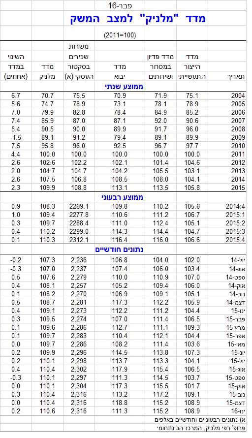 מדד מלניק למצב המשק עלה ב-0.2 אחוזים בחודש ינואר 2016. עליית המדד, על רקע תיקון חד במדד הייצור התעשייתי שהתרחש בסוף שנת 2015, מבטאת התרחבות מתונה של הפעילות במגזר העסקי. מדד הייצור התעשייתי, המשקף את צד ההיצע של המגזר העסקי, עלה עלייה חריגה של 7.3 אחוזים בחודש נובמבר וזו נשמרה גם בדצמבר. התיקון ברמת מדד הייצור התעשייתי משקף גם שיפור היצוא התעשייתי. מדד פדיון ענפי המסחר והשירותים, המשקף את הביקושים המקומיים ובעיקר את הצריכה הפרטית, שמר על רמתו הגבוהה וממחיש את עליית הצריכה הפרטית ואת השפעתה על צמיחת המשק. מדד היבוא, הכולל בעיקר יבוא תשומות לייצור מקומי, אך גם מוצרי תצרוכת, ירד וממשיך להתפתח בתנודתיות חזקה. מספר משרות השכירים במגזר העסקי עלה ומשקף איתנות בשוק העבודה.
