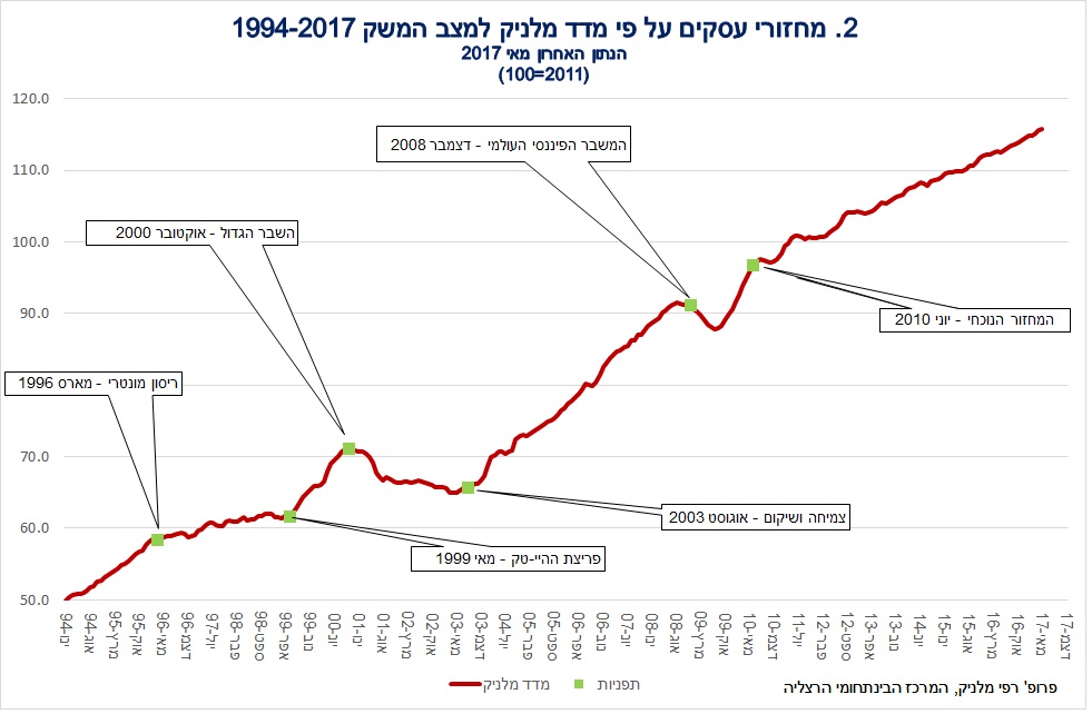 מדד מלניק למצב המשק עלה ב-0.2 אחוז בחודש מאי 2017. המשק ממשיך לצמוח בשיעור מתון. על אף מגמת הגידול הרציף של השנים האחרונות, מדד פדיון ענפי המסחר והשירותים, המשקף את הביקושים המקומיים ובעיקר את הצריכה הפרטית, מצביע החודש על התמתנות. אולם, מוקדם עדיין לקבוע האם מנוע צמיחת המשק, של השנים האחרונות, משנה כיוון. מדד הייצור התעשייתי, המשקף את צד ההיצע של המגזר העסקי, מצביע על כיוון חיובי, אף כי נראה שהמצב בשווקי העולם וחוזקת השקל ממשיכים להשפיע שלילית על התפתחותו. מדד היבוא, הכולל בעיקר יבוא תשומות לייצור מקומי, אך גם מוצרי תצרוכת, שמר על יציבות ברמה גבוהה. מספר משרות השכירים במגזר העסקי לא השתנה לעומת החודש הקודם, אך רמתו משקפת עדיין חוזקה בשוק העבודה.