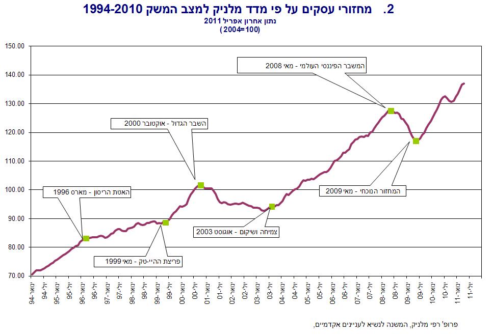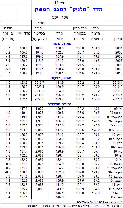 מדד מלניק למצב המשק עלה ב-0.4 אחוזים בחודש אפריל 2011. צמיחת המשק נמשכת. לאחר צמיחה מהירה של המשק, ברביע ראשון של 2011, נראה שהמשק ממשיך לצמוח ברביע השני, אם כי בשיעור נמוך מזה של הראשון. נמשך הגידול של מדד הייצור התעשייתי, המשקף התרחבות של היצע התוצר העסקי מיועד ליצוא התעשייתי, שהוא עיקר יצוא הסחורות של המשק. כמו כן נשמרת רמה גבוהה של פדיון בענפי המסחר והשירותים המשקפת רמה גבוהה של ביקושים מקומיים ובעיקר של צריכה פרטית. בנוסף נמשכת עליית מספר משרות השכירים בסקטור העסקי המבטאת המשך שיפור בשוק העבודה.