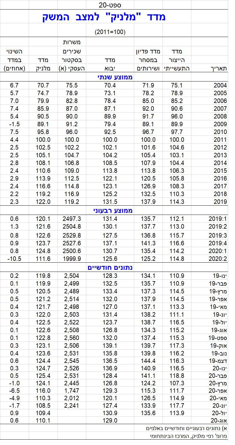 מדד מלניק למצב המשק עלה ב-0.5 אחוז בחודש ספטמבר 2020. עליית המדד משקפת התאוששות קלה בפעילות המגזר העסקי בחודשי הקיץ, טרם ההכרזה על סגר בסוף ספטמבר. למרות ההתאוששות, רמת הפעילות נותרה נמוכה מאוד. מסתבר ששחרור הסגר כשלעצמו אינו מספיק לשיקום הפעילות, כל עוד אין פתרון לנוכחות הפנדמיה. הסגר השני יביא לירידה חדה בפעילות הכלכלית. השפעה ראשונית של הסגר השני תבוא לידי ביטוי חלקי במדד אוקטובר וההשפעות המלאות יותר במדדי החודשים נובמבר ודצמבר.
