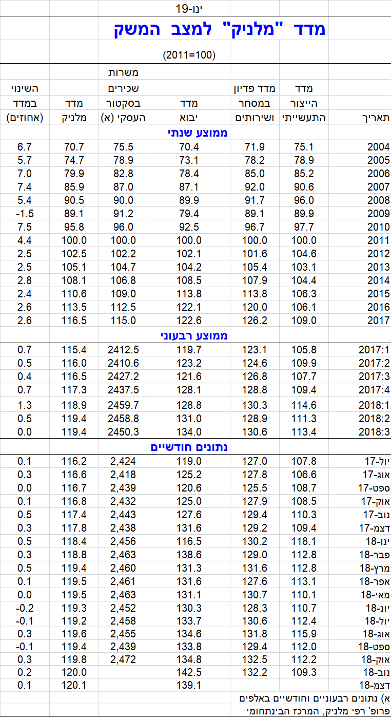 מדד מלניק למצב המשק עלה ב-0.1 אחוז בחודש דצמבר 2018. צמיחת המגזר העסקי נמשכת בשיעור מתון. פדיון ענפי המסחר והשירותים, המשקף את הביקושים המקומיים ובעיקר את הצריכה הפרטית, שומר על רמה יציבה-יחסית. התפתחות זו מבטאת את יציבות הביקושים המקומיים – בעיקר של הצריכה הפרטית; אציין שבניגוד לשנים האחרונות, הצטמצמה השפעת הצריכה הפרטית על צמיחת המשק והיא כבר לא מובילה אותה. מדד הייצור התעשייתי, המשקף את צד ההיצע של המגזר העסקי, ירד בחודש האחרון. הייצור התעשייתי הושפע, ככל הנראה, מההאטה המסתמנת בשווקים העולמיים, המקשה על היצוא. גם מדד היבוא, המשקף בעיקר יבוא תשומות לייצור המקומי, ירד, אך רמתו עדיין גבוהה ואינה מהווה מגבלה להמשך צמיחת המגזר העסקי. מספר משרות השכירים במגזר העסקי עלה ומבטא חוסן בשוק העבודה.