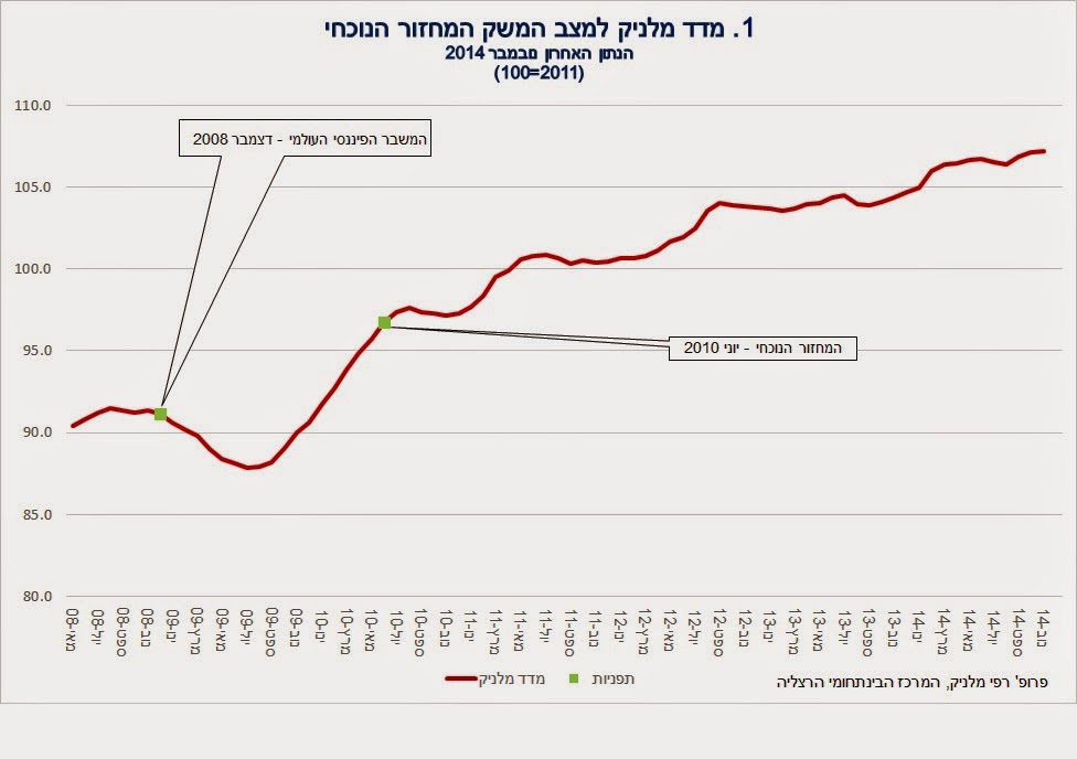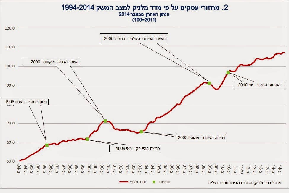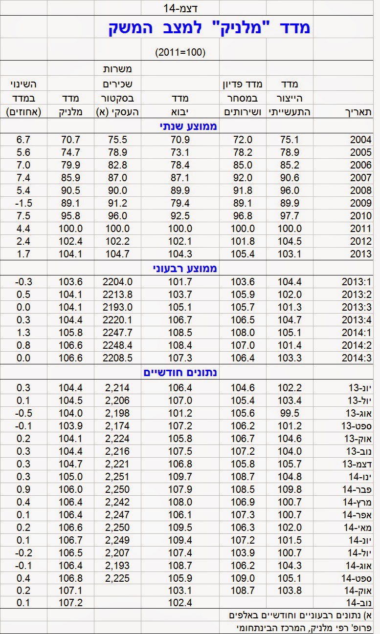 מדד מלניק למצב המשק עלה ב-0.1 אחוז בחודש נובמבר 2014. התפתחות המדד משקפת צמיחה של הפעילות המשקית בשיעור מתון. נראה ששיעור הצמיחה במשק חוזר לשיעורו במחצית הראשונה של 2014, לאחר היחלשותו ברביע השלישי. מדד הייצור התעשייתי ופדיון ענפי המסחר והשירותים ירדו באוקטובר, לאחר התאוששותם בעקבות סיום מבצע “צוק איתן”. מדד היבוא, הכולל בעיקר יבוא תשומות לייצור המקומי, המשיך לרדת; הירידה קשורה, ככל הנראה, להיחלשות השקל. מספר משרות השכירים במגזר העסקי עלה ומשקף התייצבות בשוק העבודה לאחר תקופת רפיון שהסתמן בחדשים האחרונים.