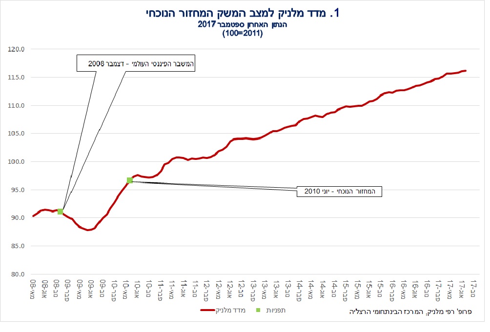 מדד מלניק למצב המשק עלה ב-0.1 אחוז בחודש ספטמבר 2017. המגזר העסקי ממשיך להתרחב בשיעור מתון. עליית מדד פדיון ענפי המסחר והשירותים, המשקף את הביקושים המקומיים ובעיקר את הצריכה הפרטית, מצביעה על חידוש הגידול. הצריכה הפרטית חוזרת להוביל את צמיחת המשק, לאחר התמתנות מסוימת במחצית הראשונה של השנה. מדד הייצור התעשייתי, המשקף את צד ההיצע של המגזר העסקי, ממשיך לרדת למרות השיפור המסתמן בשווקים העולמיים; נראה כי חוזקת השקל ממשיכה להשפיע לשלילה על התפתחותו, דרך השפעתו על יצוא המגזר התעשייתי; ירידת הייצור התעשייתי מהווה מגבלה ליכולת המשק לנצל את פוטנציאל צמיחתו. מדד היבוא, הכולל בעיקר יבוא תשומות לייצור מקומי, ממשיך להתרחב בשיעור ויאפשר האצת הצמיחה בסוף השנה. מספר משרות השכירים במגזר העסקי עלה בשיעור דומה לירידתו בחודש הקודם, ורמת המשרות משקפת חוזקה בשוק העבודה.