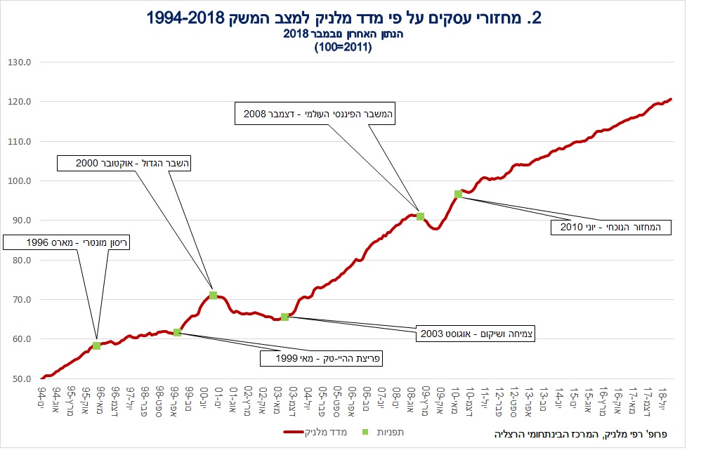 מדד מלניק למצב המשק עלה ב-0.2 אחוז בחודש נובמבר 2018. צמיחת המגזר העסקי נמשכת. נמשכת התנודתיות בפדיון ענפי המסחר והשירותים סביב רמה יציבה-יחסית. תנודתיות זו בפדיון, המשקף את הביקושים המקומיים ובעיקר את הצריכה הפרטית, מבטאת יציבות של הביקושים המקומיים; מדד הייצור התעשייתי, המשקף את צד ההיצע של המגזר העסקי, עלה קלות בחודש האחרון לאחר ירידה חזקה שנרשמה בחודש הקודם. בסך הכל, רמת הייצור התעשייתי דומה לזו ששררה אשתקד, כלומר לא נרשמה צמיחה כלל; התפתחות זו מעידה על כך שהתעשייה לא התגברה על הקשיים בפניהם ניצב הענף. מדד היבוא, המשקף בעיקר יבוא תשומות לייצור המקומי, עלה בחדות ומבטא, ככל הנראה, אפשרות להמשך צמיחת המגזר העסקי. מספר משרות השכירים במגזר העסקי מבטא חוסן בשוק העבודה.