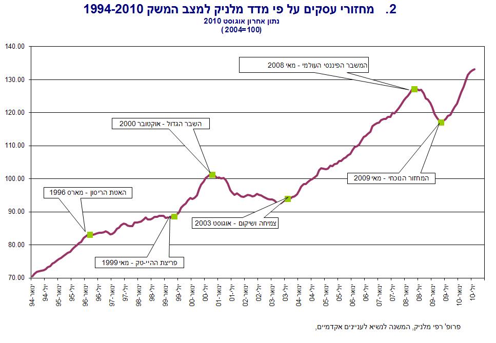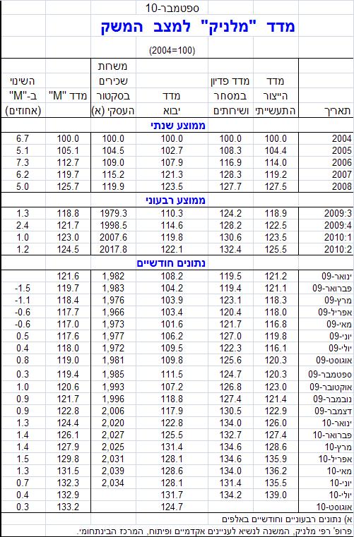 מדד מלניק למצב המשק עלה ב-0.3 אחוזים בחודש אוגוסט 2010. המדד החודש ועדכון כלפי מעלה של המדד בחודש הקודם מצביעים על כך שהצמיחה של המשק נמשכת. אומנם שיעור הצמיחה נמוך יותר מזה של המחצית הראשונה של 2010 אך הוא חיובי והפעילות העסקית ממשיכה להתרחב. העלייה של 2.6 ושל 2.1 אחוזים במדדי הייצור התעשייתי ובפדיון בענפי המסחר והשירותים בחודש יולי בהתאמה, מתקנים את הירידות שנרשמו במדדים אלה בחודש הקודם ומראים בבירור שהמשק ממשיך לצמוח. הצמיחה מבטאת התרחבות ההיצע של המגזר התעשייתי שנענית, ככל הנראה, לביקוש ליצוא מחו”ל וגם התרחבות של הביקושים המקומיים, ככל הנראה בעיקר של הצריכה הפרטית.