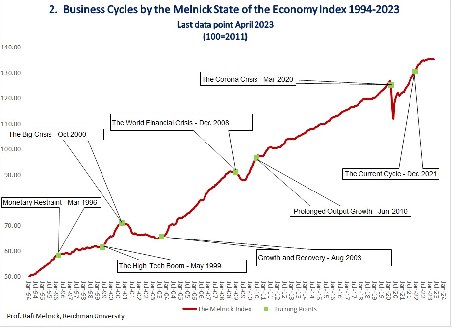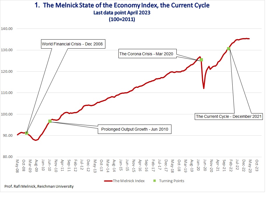 The Melnick State of the Israeli Economy Index remained unchanged in April 2023, indicating a halt in the growth of the business sector. According to the Index, the level of activity in the business sector during April 2023 is similar to that of November 2022. This slowdown in business sector activity began in the last quarter of 2022, primarily due to negative global developments and further exacerbated by attempted government legal legislation. The revenue in trade and services, which reflects domestic demand and particularly private consumption, indicates stagnation in private consumption. The industrial production index, which reflects the supply side of the business sector, continues to experience significant fluctuations without a clear trend, highlighting ongoing weakness. The import index, primarily composed of inputs for domestic production, did not decrease this month after a continuous decline since October 2022. However, it remains 11.4% lower compared to the corresponding month last year, suggesting a potential future decline in business sector activity. Furthermore, the number of employee posts in the business sector has once again decreased, indicating that the growth slowdown may now be affecting the labor market as well.