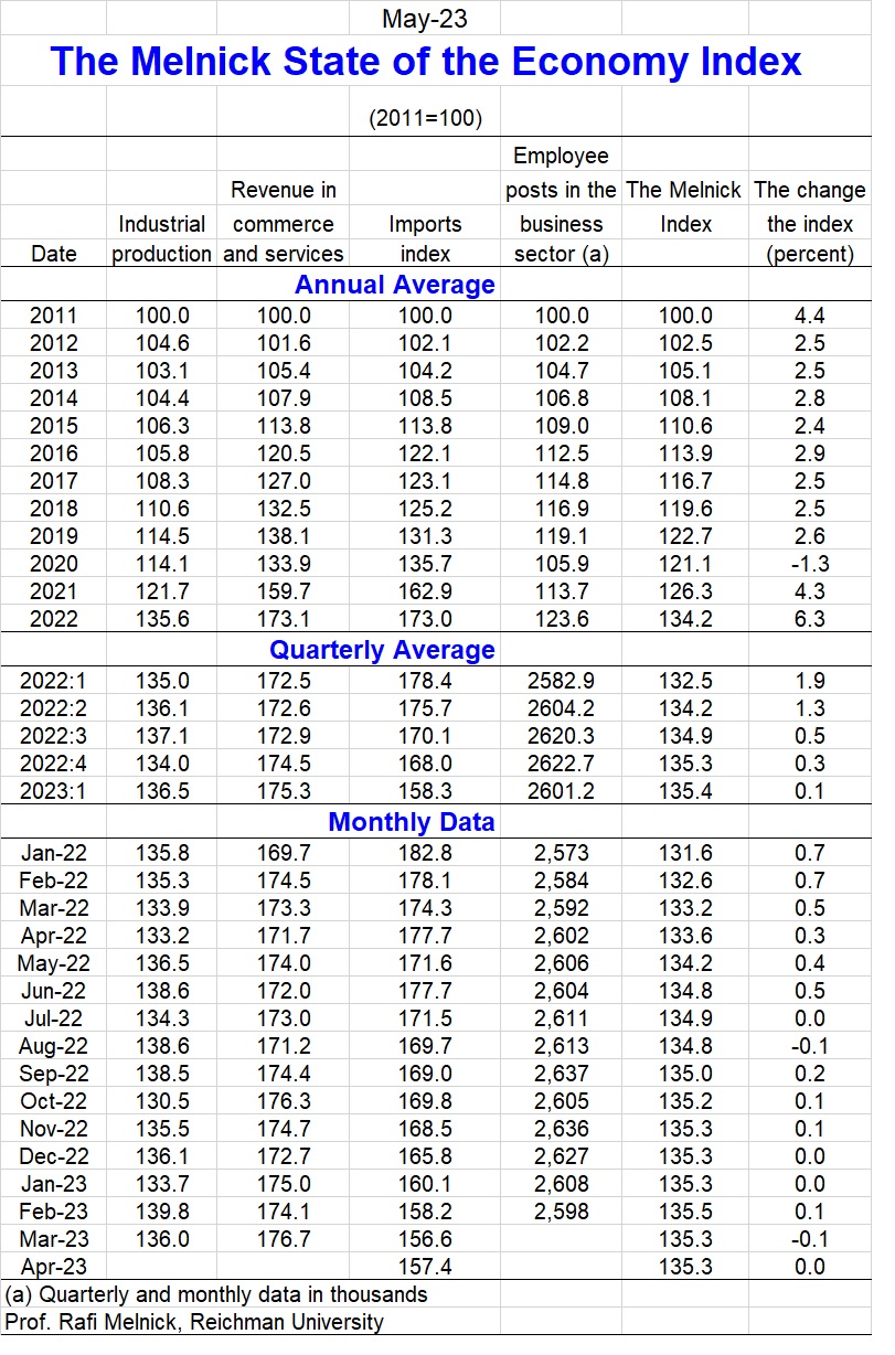The Melnick State of the Israeli Economy Index remained unchanged in April 2023, indicating a halt in the growth of the business sector. According to the Index, the level of activity in the business sector during April 2023 is similar to that of November 2022. This slowdown in business sector activity began in the last quarter of 2022, primarily due to negative global developments and further exacerbated by attempted government legal legislation. The revenue in trade and services, which reflects domestic demand and particularly private consumption, indicates stagnation in private consumption. The industrial production index, which reflects the supply side of the business sector, continues to experience significant fluctuations without a clear trend, highlighting ongoing weakness. The import index, primarily composed of inputs for domestic production, did not decrease this month after a continuous decline since October 2022. However, it remains 11.4% lower compared to the corresponding month last year, suggesting a potential future decline in business sector activity. Furthermore, the number of employee posts in the business sector has once again decreased, indicating that the growth slowdown may now be affecting the labor market as well.